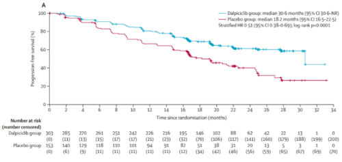 DAWNA-2研究在期中分析时达到其主要终点。达尔西利+来曲唑/阿那曲唑的中位PFS为30.6个月(95% CI: 30.6-未达到[NR]),安慰剂+来曲唑/阿那曲唑为18.2个月(95% CI: 16.5-22.5),联合达尔西利治疗延长了12.4个月的PFS,降低疾病进展或死亡风险49%(HR=0.51;95% CI: 0.38-0.69,P<0.0001)。研究者评估的PFS与BIRC评估的PFS相似(NR vs 22.5个月,HR=0.50)。