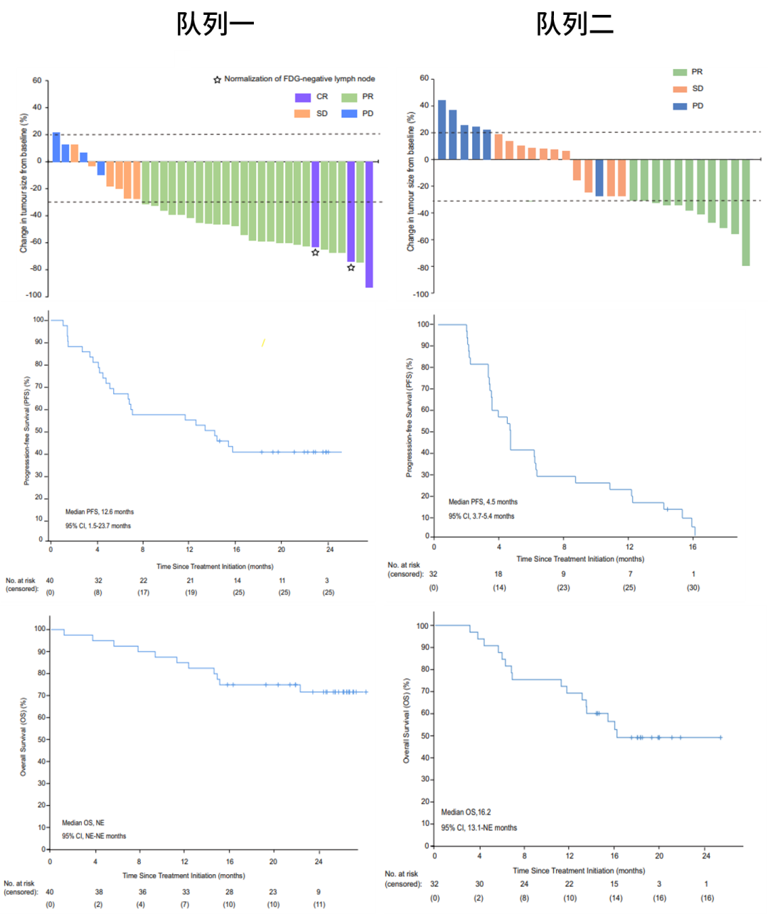 2020年9月至2021年1月,共入组72例受试者,其中队列一入组40例,队列二入组32例。截至2022年10月,队列一的中位随访时间为23.3个月,ORR为65%,DCR为80%,中位PFS为12.6个月,中位OS没有达到。队列二的中位随访时间为18.5个月,ORR为34.4%,DCR为68.8%,中位PFS为4.5个月,中位OS为16.2个月。
