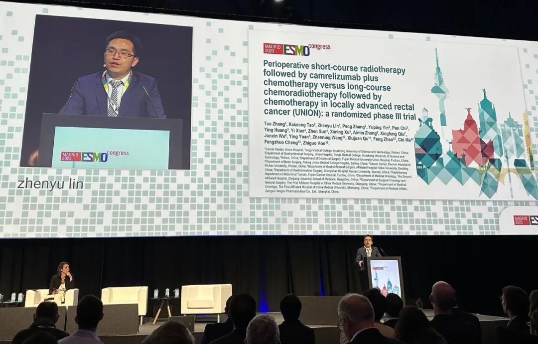 10月21日,PA电子医药创新药卡瑞利珠单抗的一项研究“新辅助短程放疗序贯卡瑞利珠单抗联合化疗对比长程放化疗序贯化疗治疗局部晚期直肠癌”随机对照Ⅲ期试验(UNION)亮相2023 ESMO大会优选口头报告现场。该研究由华中科技大学同济医学院附属协和医院张涛教授、陶凯雄教授担任主要研究者,华中科技大学同济医学院附属协和医院林振宇教授在大会现场报告了该重磅研究的结果1。此项研究是全球首个评估短程放疗序贯免疫治疗联合化疗治疗局部晚期直肠癌的Ⅲ期研究,已达到主要终点病理完全缓解(pCR),有望为直肠癌患者的治疗提供新策略。