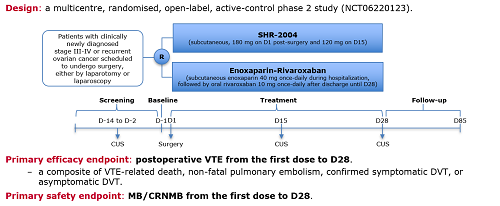 研究纳入年龄≥18周岁、自愿接受手术治疗、临床诊断为III-IV期的初治卵巢癌或复发性卵巢癌患者,按1:1比例随机分配至试验组或阳性对照组。试验组在术后4~8小时接受SHR-2004 180 mg单次皮下注射,2周后接受SHR-2004 120 mg单次皮下注射;对照组住院期间接受依诺肝素40 mg每日一次皮下注射,出院后改为利伐沙班10 mg每日一次口服,至少持续治疗至D28。