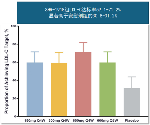 与安慰剂组相比,SHR-1918 各剂量组的LDL-C水平显著降低,TG水平也呈现相似趋势。与安慰剂组相比,接受 SHR-1918 治疗的患者在 LDL-C 达标率方面表现更佳。