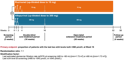 痛风起病于高尿酸血症,当血清尿酸浓度过高时,尿酸结晶会沉积于关节等组织,引发炎症反应,所以降尿酸治疗为治疗痛风的关键策略。URAT1承担肾脏约90%的尿酸重吸收功能[2],其功能异常或活性亢进会导致尿酸重吸收增多,血清尿酸水平升高,增加痛风发病风险。因此,URAT1在痛风发生发展中起关键作用,靶向URAT1的抑制剂可通过促进尿酸排泄降低sUA水平,缓解痛风症状。鲁兹诺雷钠片是PA电子医药自主研发的一种高选择性URAT1抑制剂,在前期的一期、二期研究中,鲁兹诺雷钠片耐受性良好,并显示出显著降低高尿酸血症患者sUA的效果[3]。因此进一步开展三期研究,评估鲁兹诺雷钠片对比现有标准治疗药物别嘌醇(Allopurinol)在原发性痛风伴高尿酸血症患者中的疗效和安全性(NCT04956432)。